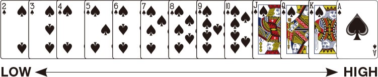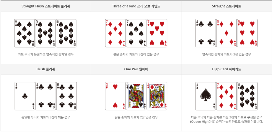카드는 Ace, King, Queen, Jack, 10, 9…3, 2순으로 높은 값을 가지며 Ace는 2, 3과 조합될 때 1의 값으로 사용됩니다. 플레이어와 딜러가 같은 값의 페어를 가졌을 때 세 번째 카드의 값이 높은 쪽이 이기게 됩니다.