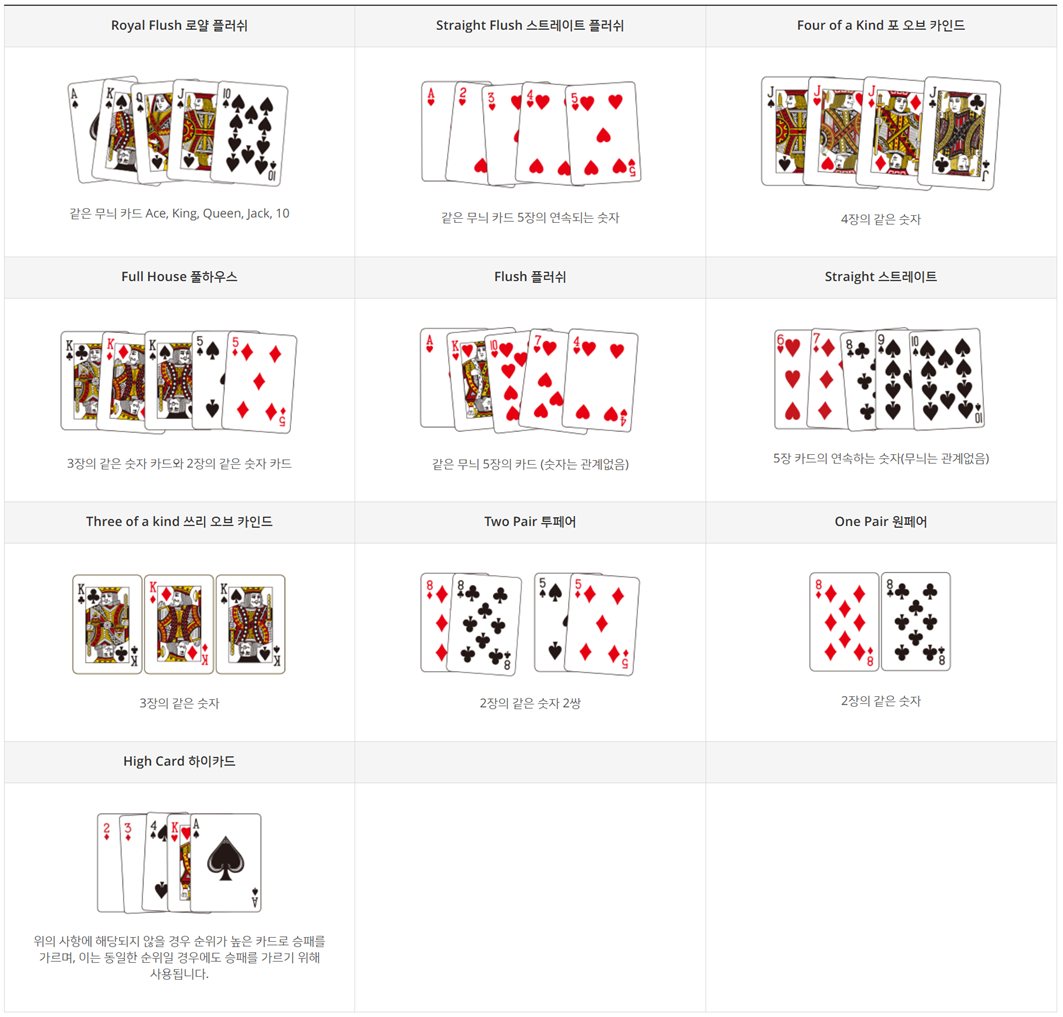 ● 게임의 승리는 패(Hand)의 순위에 따라 결정됩니다.