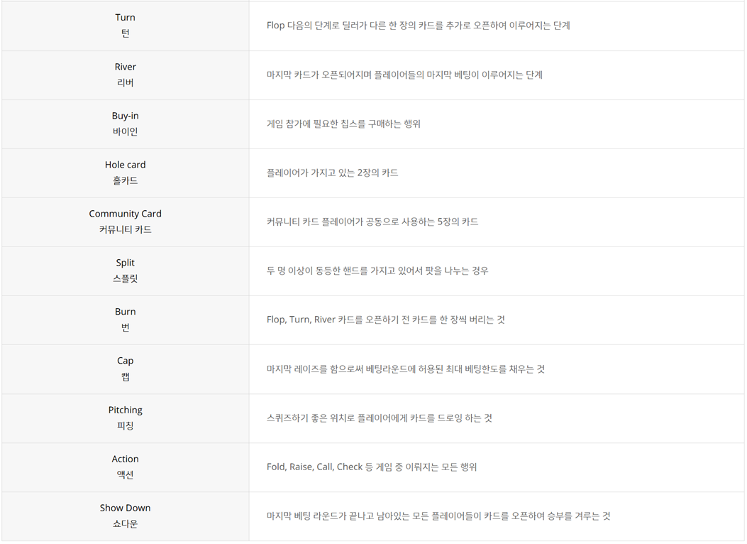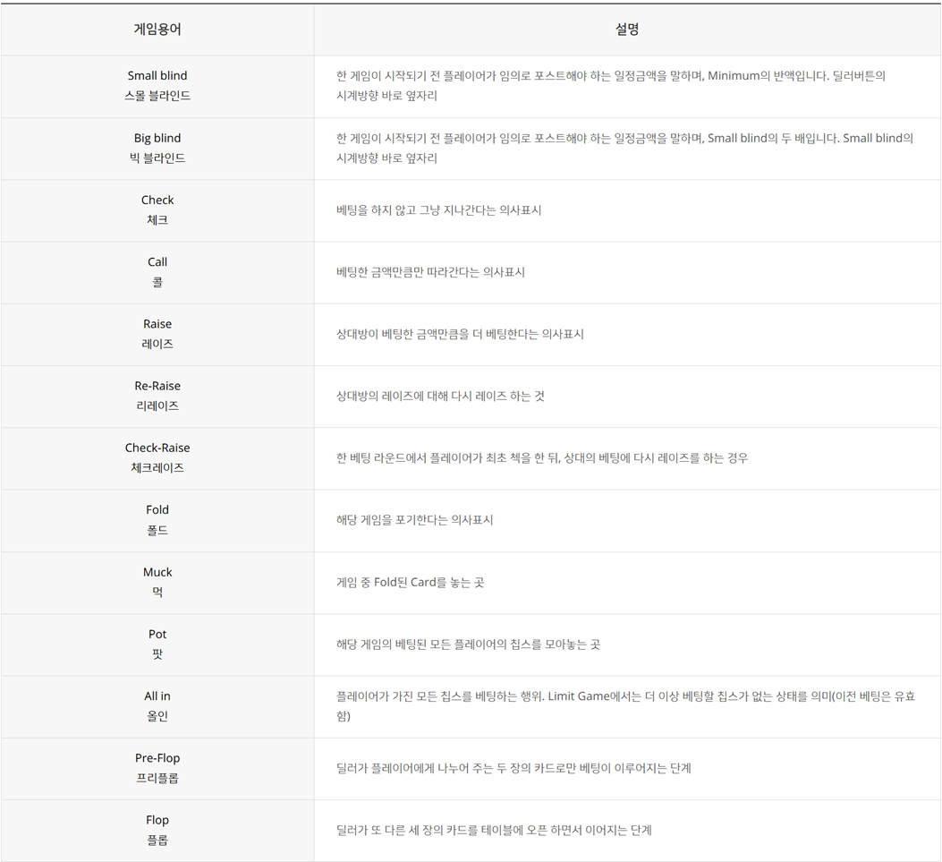 1Deck(52장)의 카드를 사용하여 각각의 플레이어가 2장의 플레이어 카드와 5장의 커뮤니티 카드를 포함한 총 7장의 카드를 이용하여다른 플레이어를 기권하게 하거나 높은 핸드를 소유한 플레이어가 이기는 게임입니다.