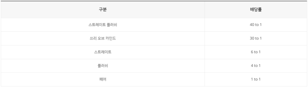 플레이어가 Pair Plus베팅을 한 경우 카드의 승패와 관계없이 플레이어 본인의 카드에서 다음과 같은 서열이 나온 경우 정해진 배당금을 받게 됩니다.