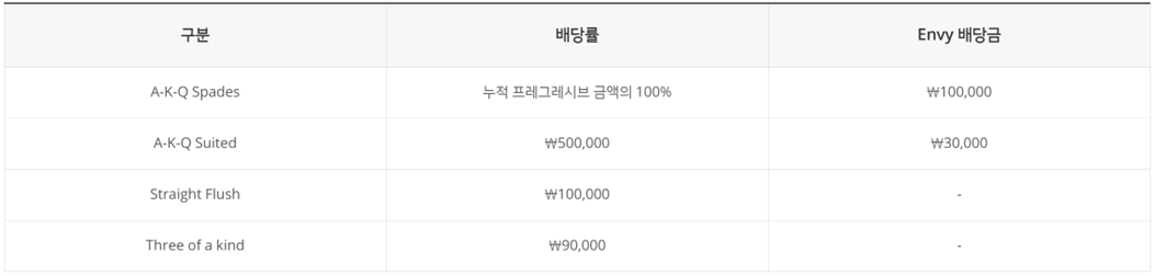 프로그레시브 베팅금액은 ₩1,000이며 동일한 테이블에서 게임하는 플레이어 중 A-K-Q Spades 또는 A-K-Q Suited가 발생한 경우 프로그레시브 베팅을 한 플레이어는 Envy 배당금을 지급 받습니다. 잭팟 시작금액은 ₩1,000,000원이며, 누적 잭팟 금액이 배당금 미만일 경우 배당금에 해당하는 금액을 지급합니다.