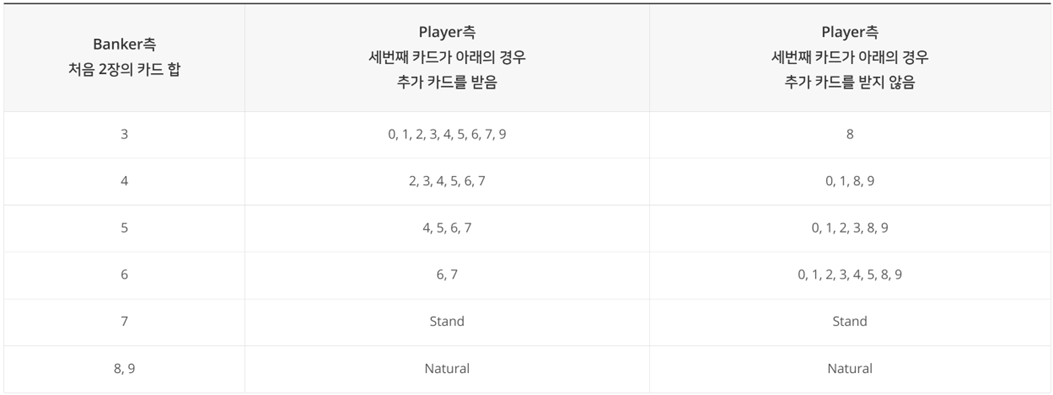 ● 플레이어측 처음 2장의 카드 합이 5이하인 경우, 뱅커측 처음 2장의 카드 합이 2이하이면 양쪽 모두 추가카드 한 장을 받아야 하지만, 뱅커측 처음 2장의 카드 합이 3이상이면 다음의 Rule을 따릅니다.